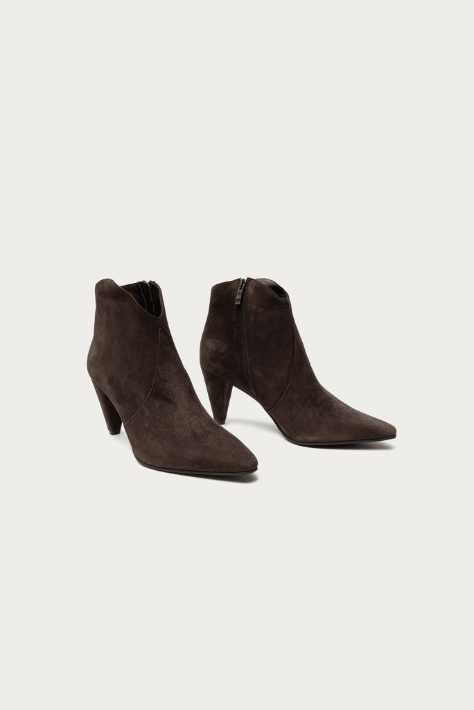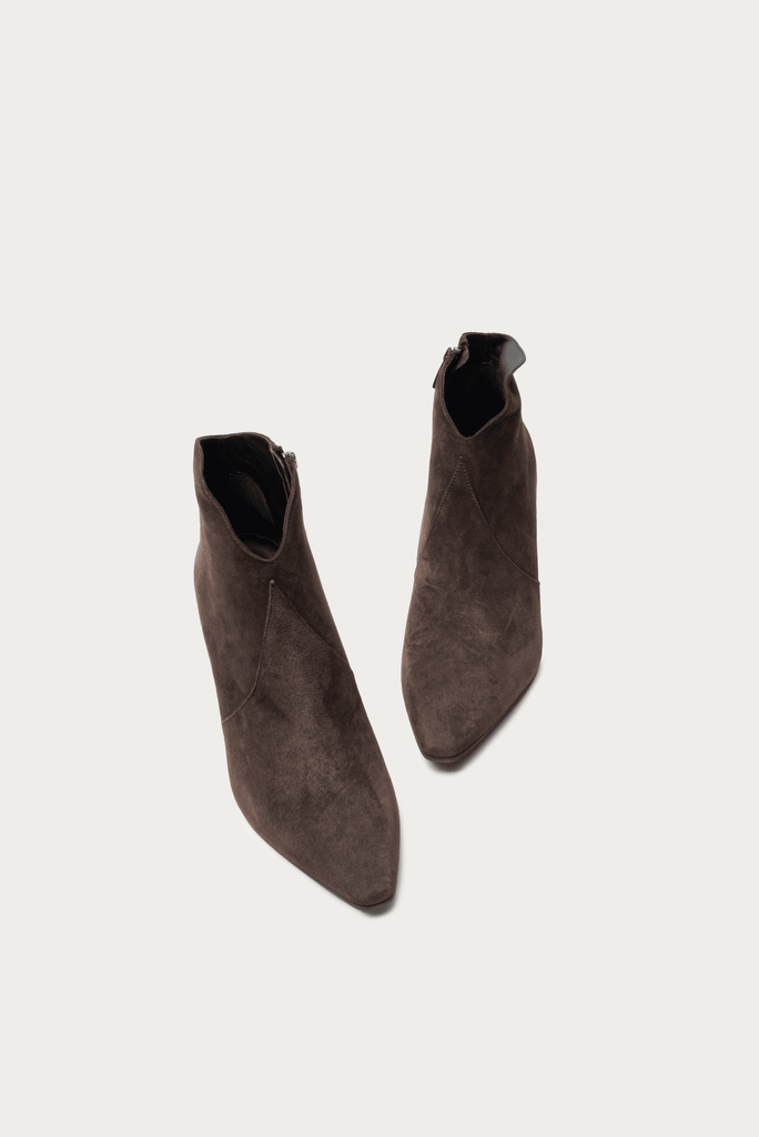 Dieser schlichte hohe Stiefel mit spitzer Zehenpartie wurde aus braunem Wildleder gefertigt und mit einem Reissverschluss an der Innenseite versehen.
