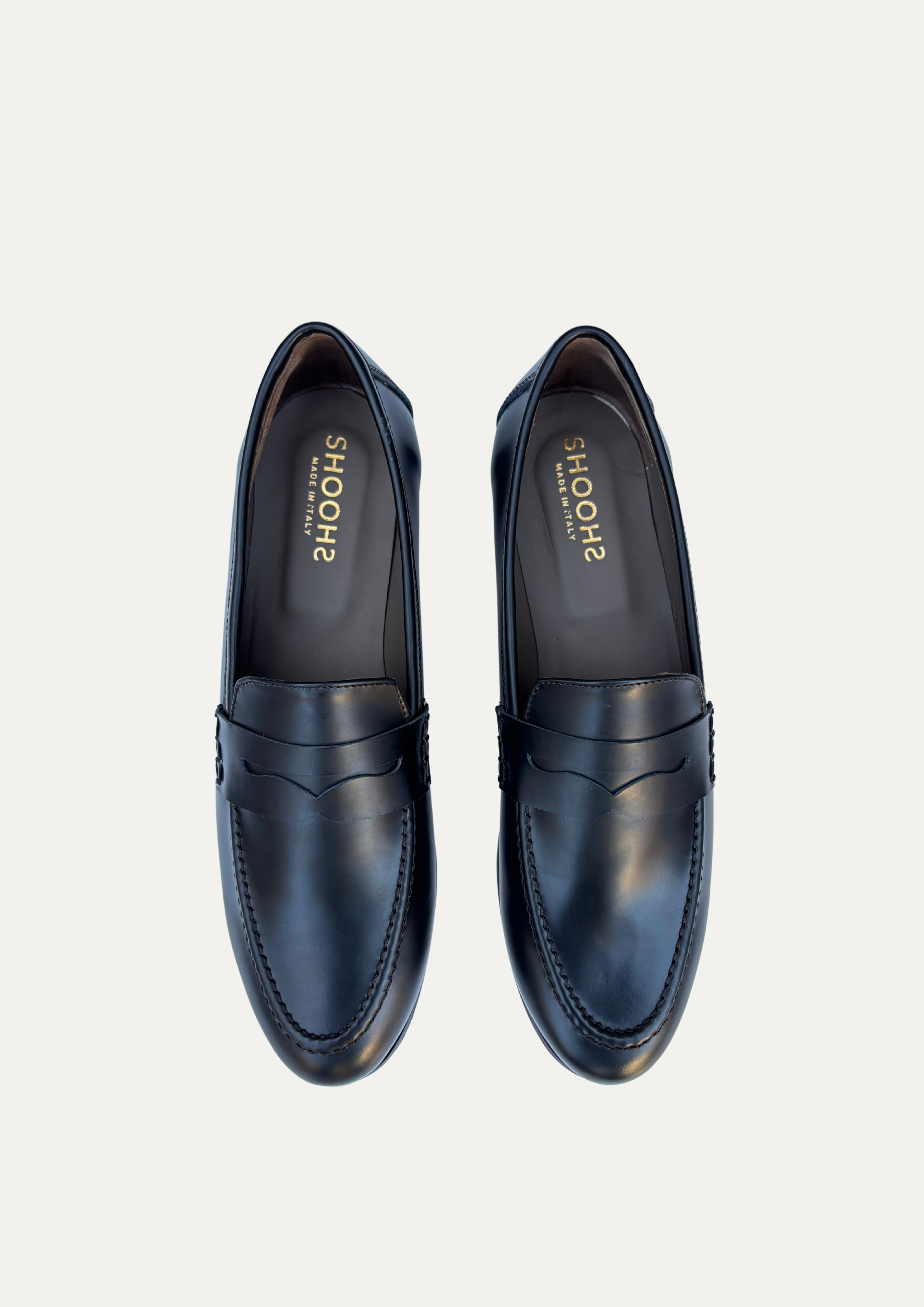 Diese dunkelblauen Penny Loafers sind ein Klassiker. Das hochwertige Glattleder und schlichte Zierriemen machen sie zeitlos und vielseitig einsetzbar. Das Modell eignet sich perfekt für den Alltag oder als maskuliner Bruch zu romantischen Kleidern.