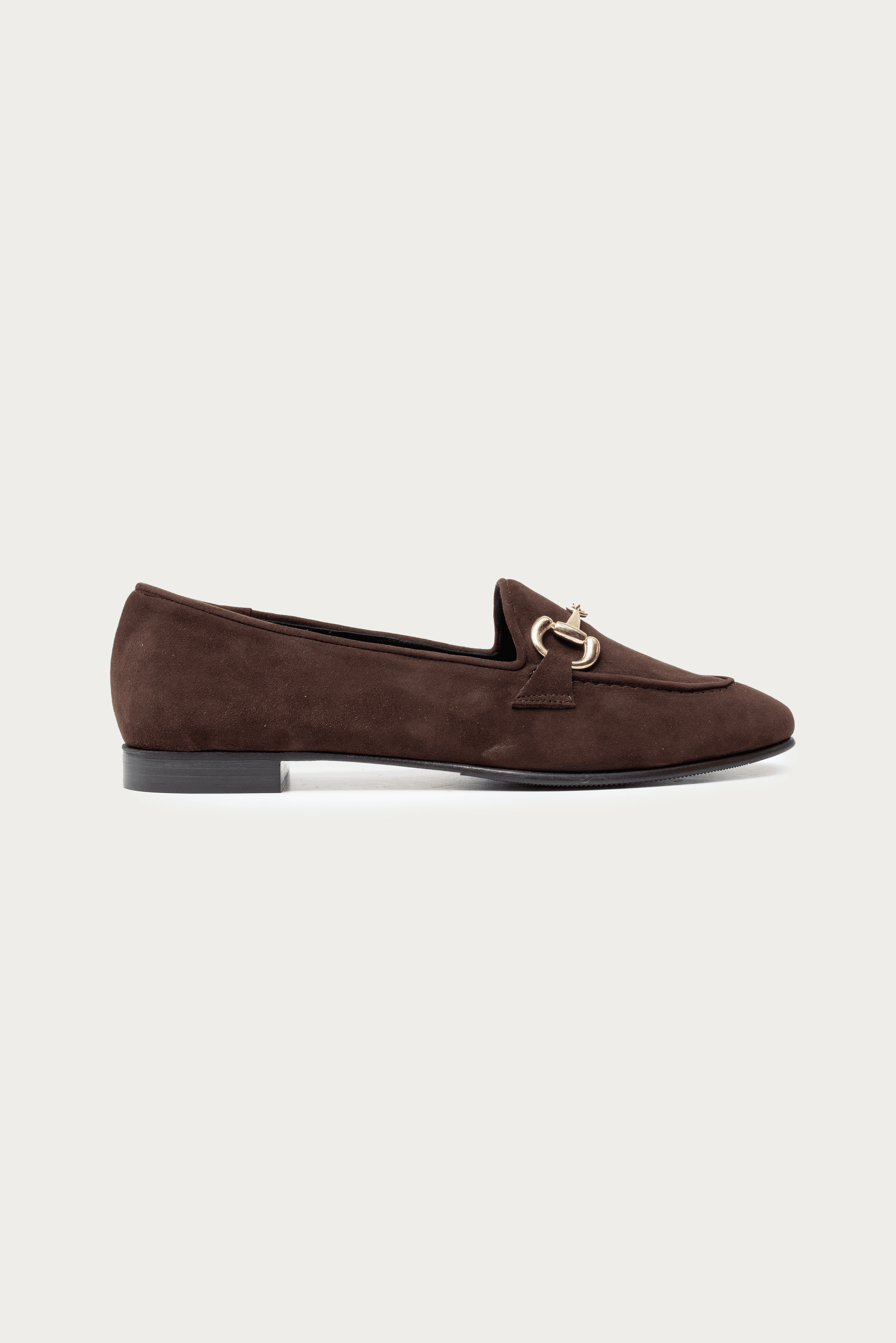 Die Horsebit Loafers wurden in Italien aus Wildleder gefertigt. Das geradlinige Design verbindet maskuline Elemente mit einer schmalen Silhouette, die äußerst feminin wirkt. Eine charakteristische antikgoldfarbene Trensenschnalle rundet das Modell ab.