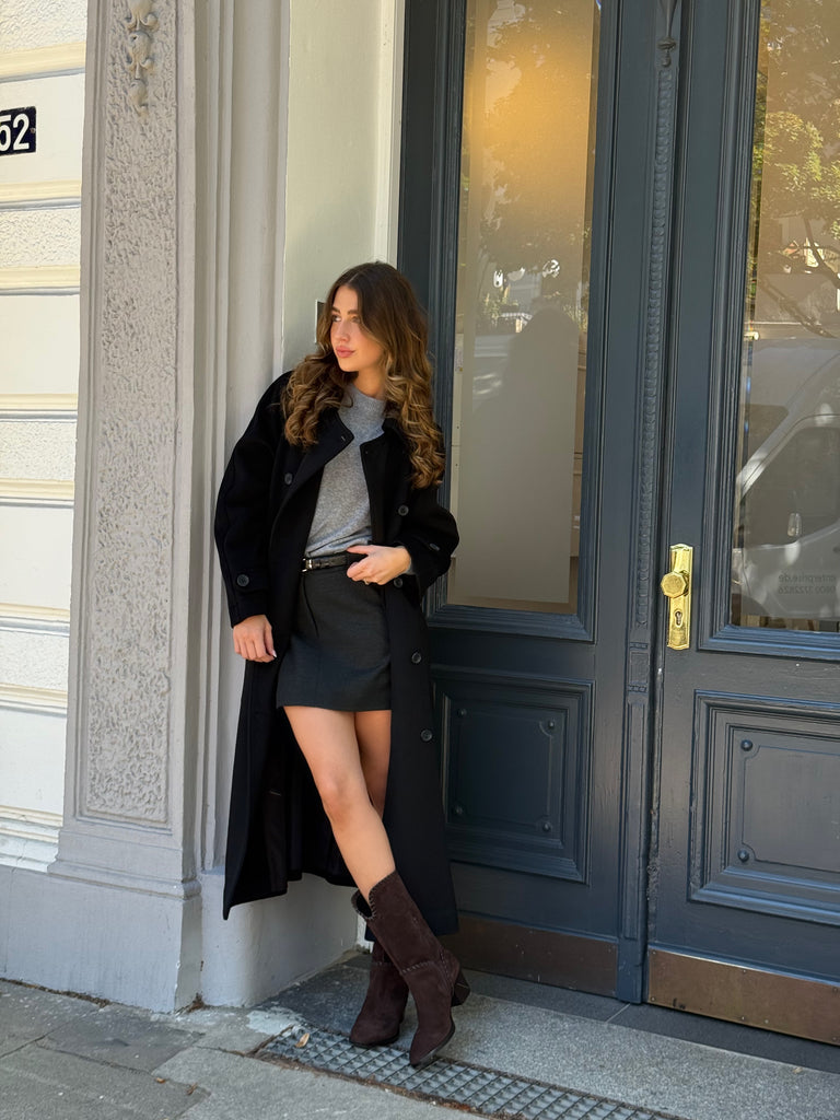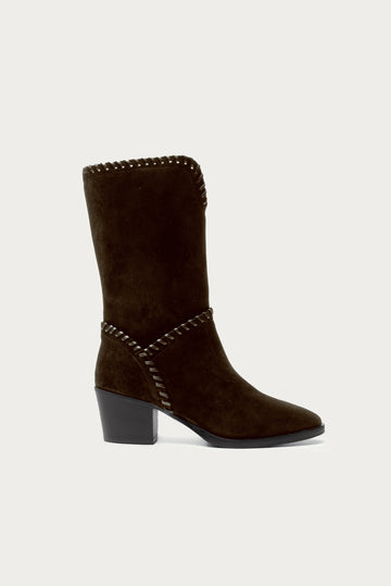 Unsere hohen Stiefel aus Veloursleder wurden in Italien handgefertigt. Das Design mit 6cm hohen Blockabsätzen verfügt über eine runde Zehenpartie und mit geflochtenen Lederdetails.
