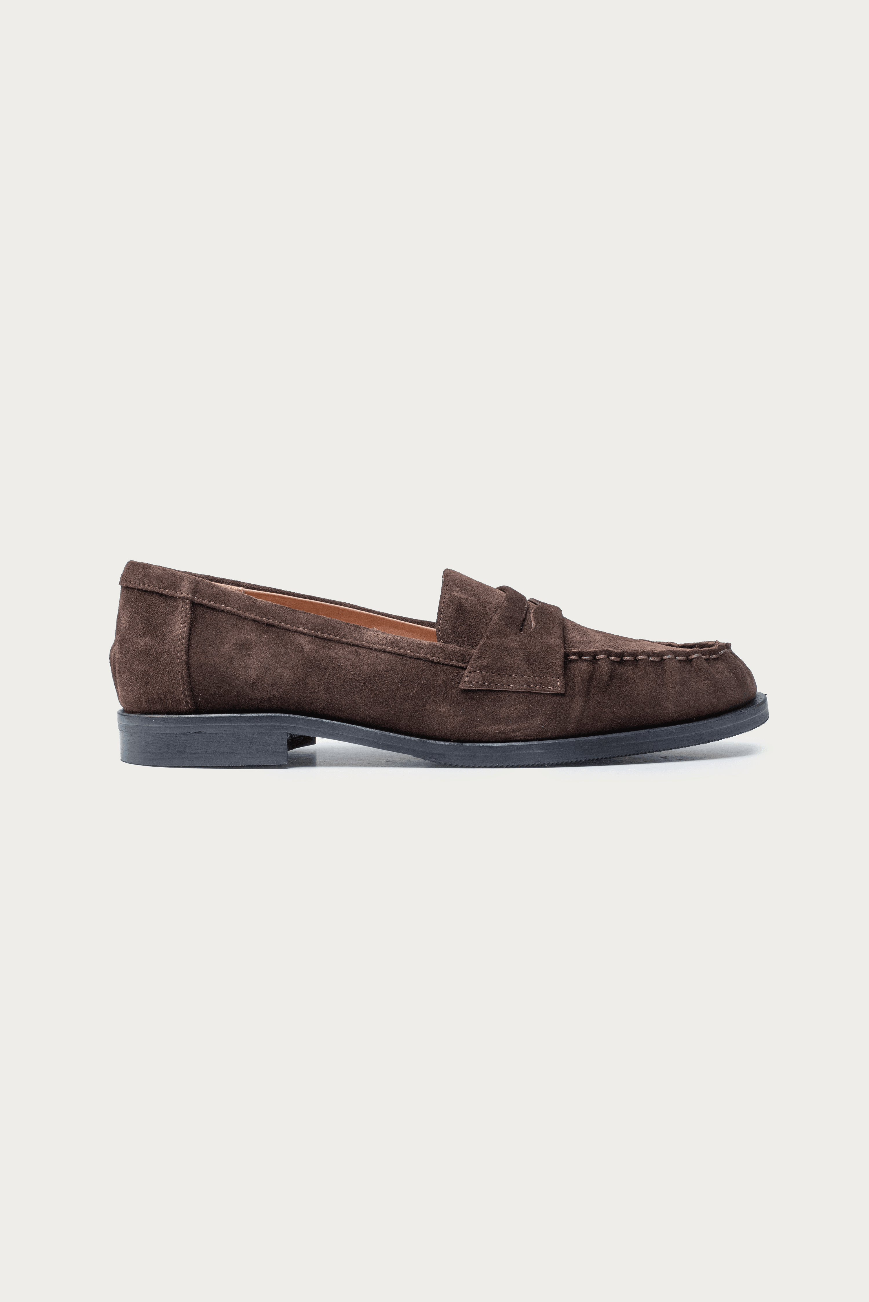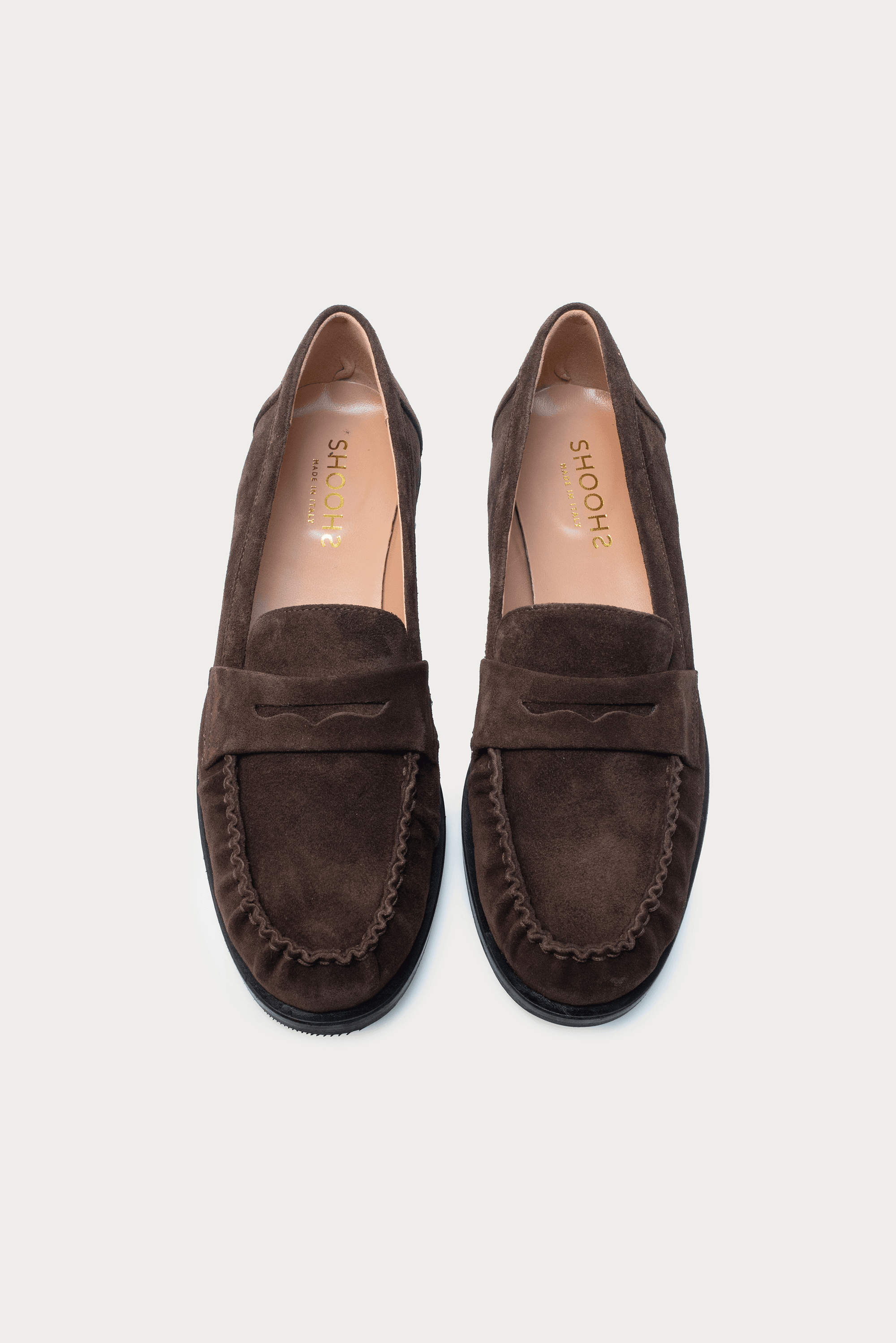 Diese dunkelbraunen Penny Loafer sind eine zeitlose Option mit einem toughen Twist. Sie sind aus robusten Wildleder gefertigt und mit Mokassin-Nähten, Penny-Stegen und markanten Laufsohlen ausgestattet.