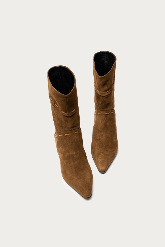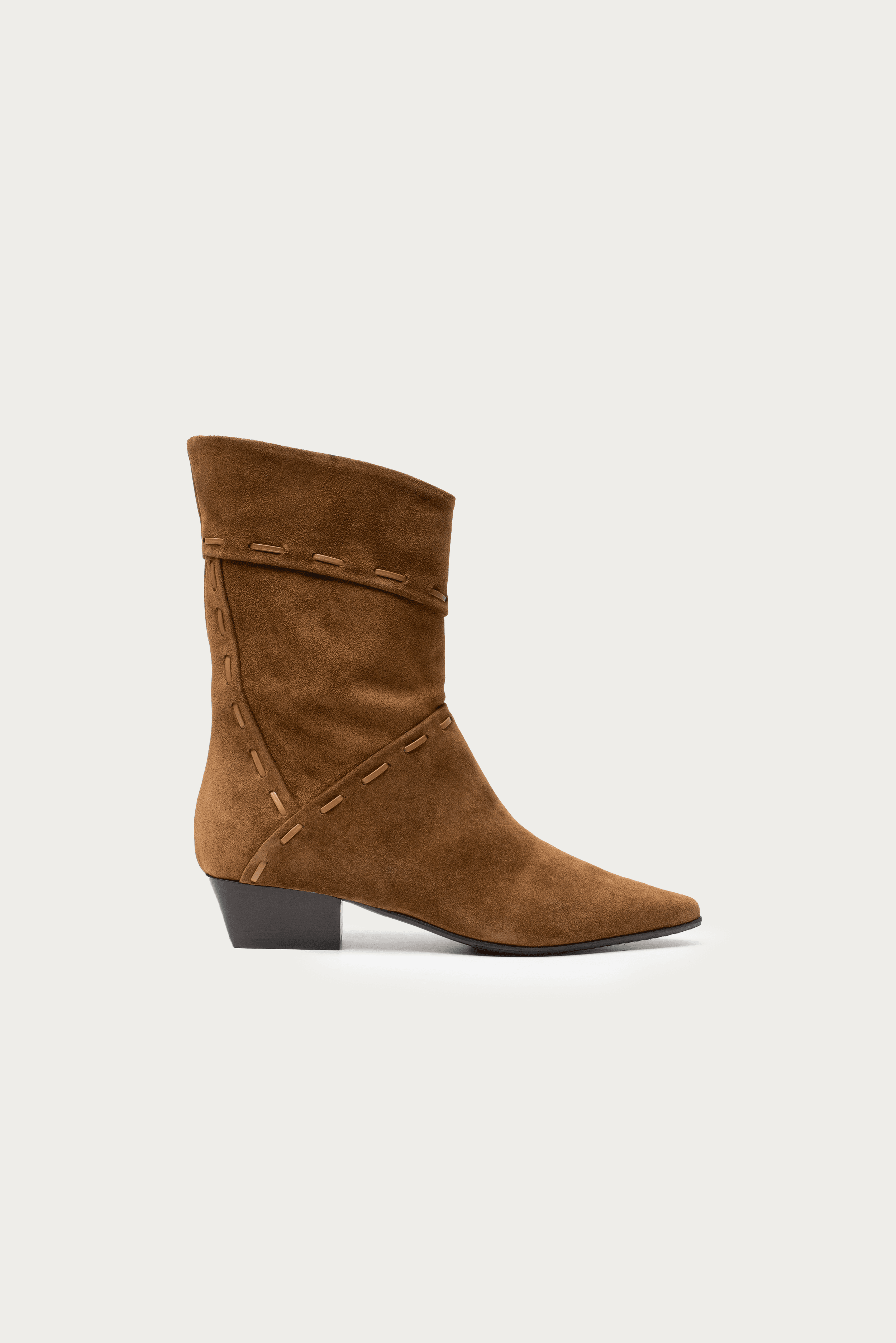 Diese halbhohen Stiefel wurden aus Velourleder gefertigt und verfügen über eine spitze Zehenpartie und eine Umschlagklappe mit geflochtenen Lederdetails. Einfach lässig.