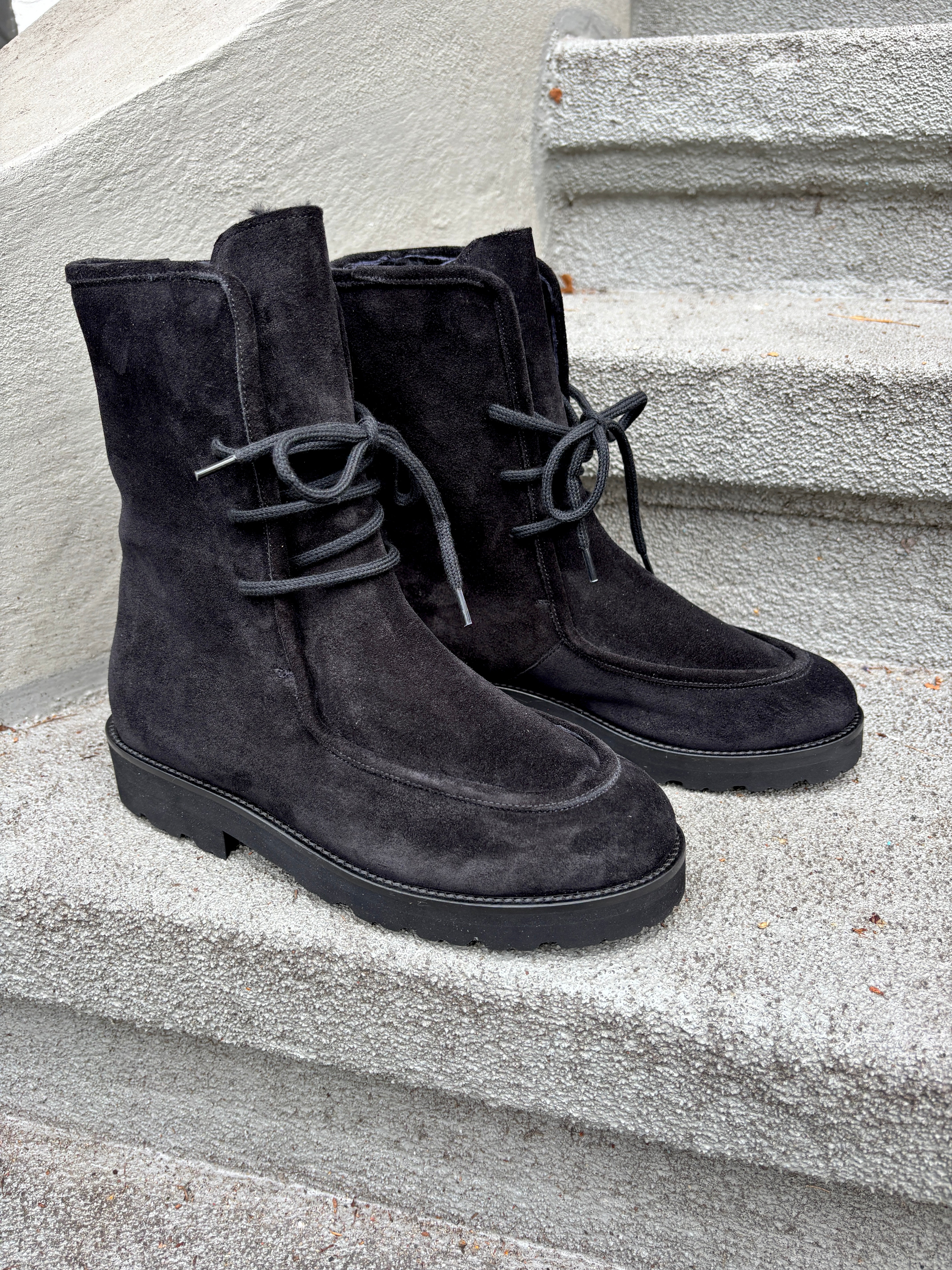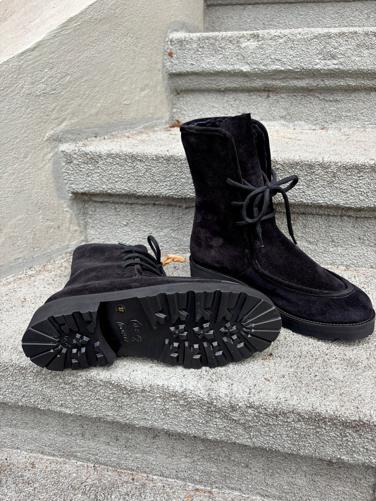 Eleganz Made in Italy. Diese mit Lammfell gefütterten Winterstiefel begeistert mit hochwertigem Veloursleder, das für angenehmen Tragekomfort sorgt. Der hohe Schaft mit klassischer Schnürung rundet das Gesamtbild harmonisch ab.