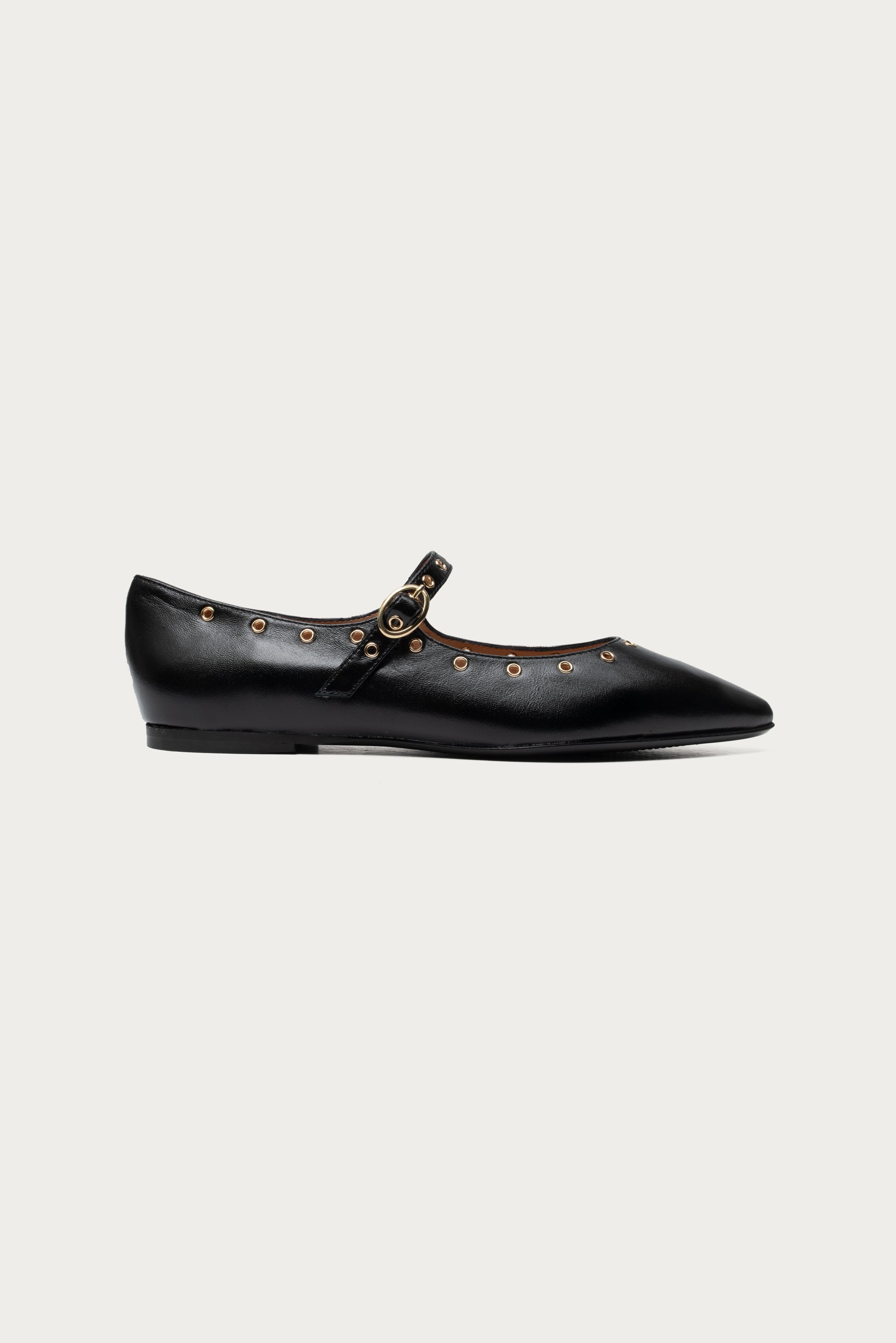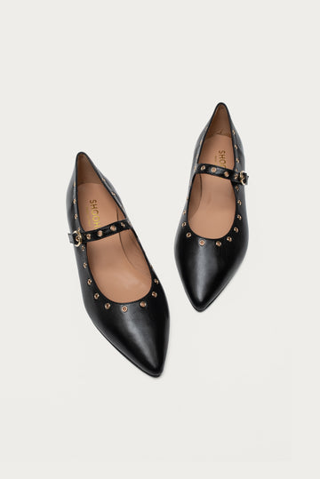 Diese spitzen Ballerinas mit Riemchen vereinen cooles Design mit italienischer Handwerkskunst. In klassischem Schwarz, spitzer Form und kleinen goldenen Nieten Details, perfekt für die neue Saison.
