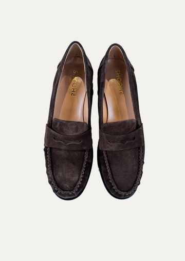 Diese dunkelbraunen Penny Loafer sind eine zeitlose Option mit einem toughen Twist. Sie sind aus robusten Wildleder gefertigt und mit Mokassin-Nähten, Penny-Stegen und markanten Laufsohlen ausgestattet.