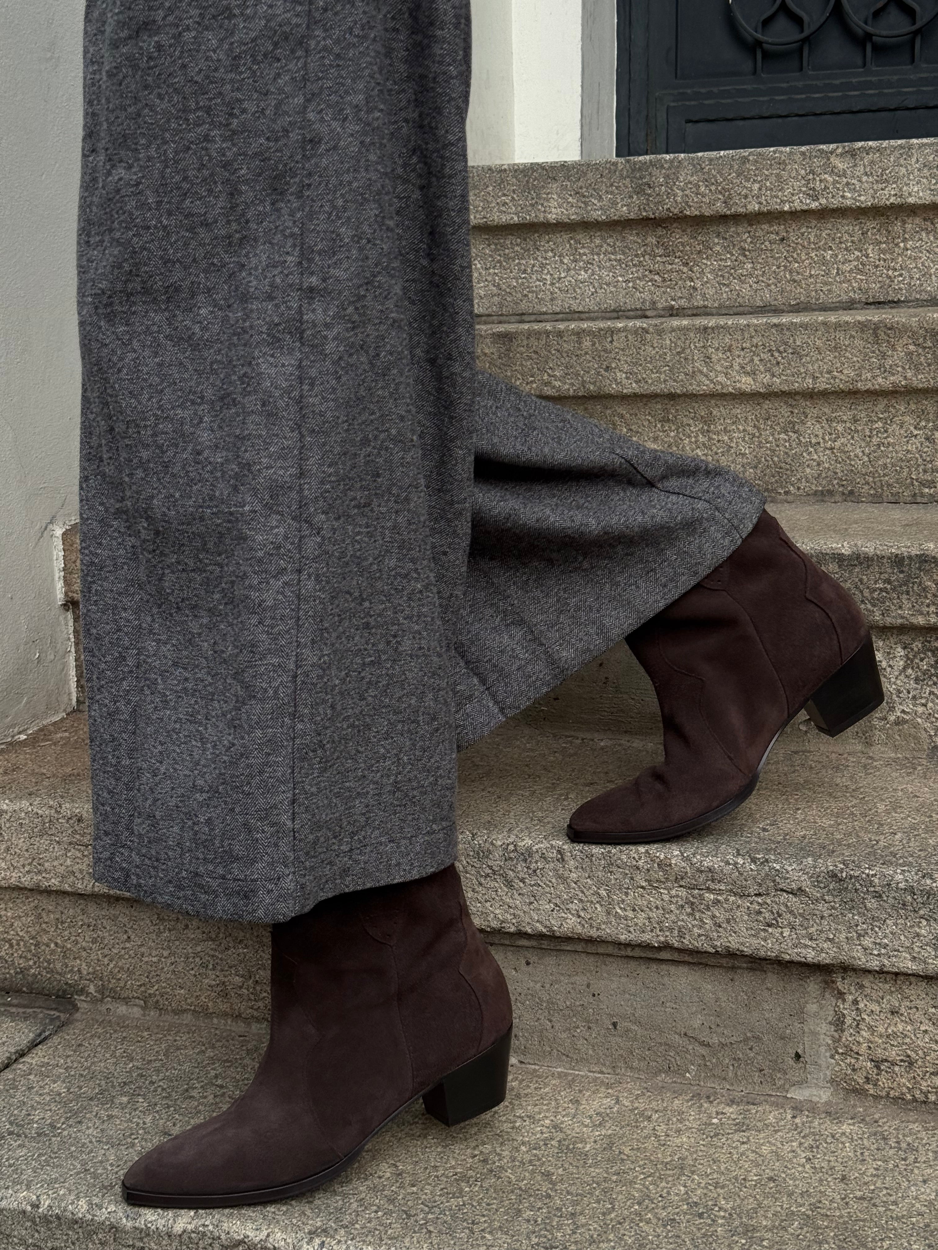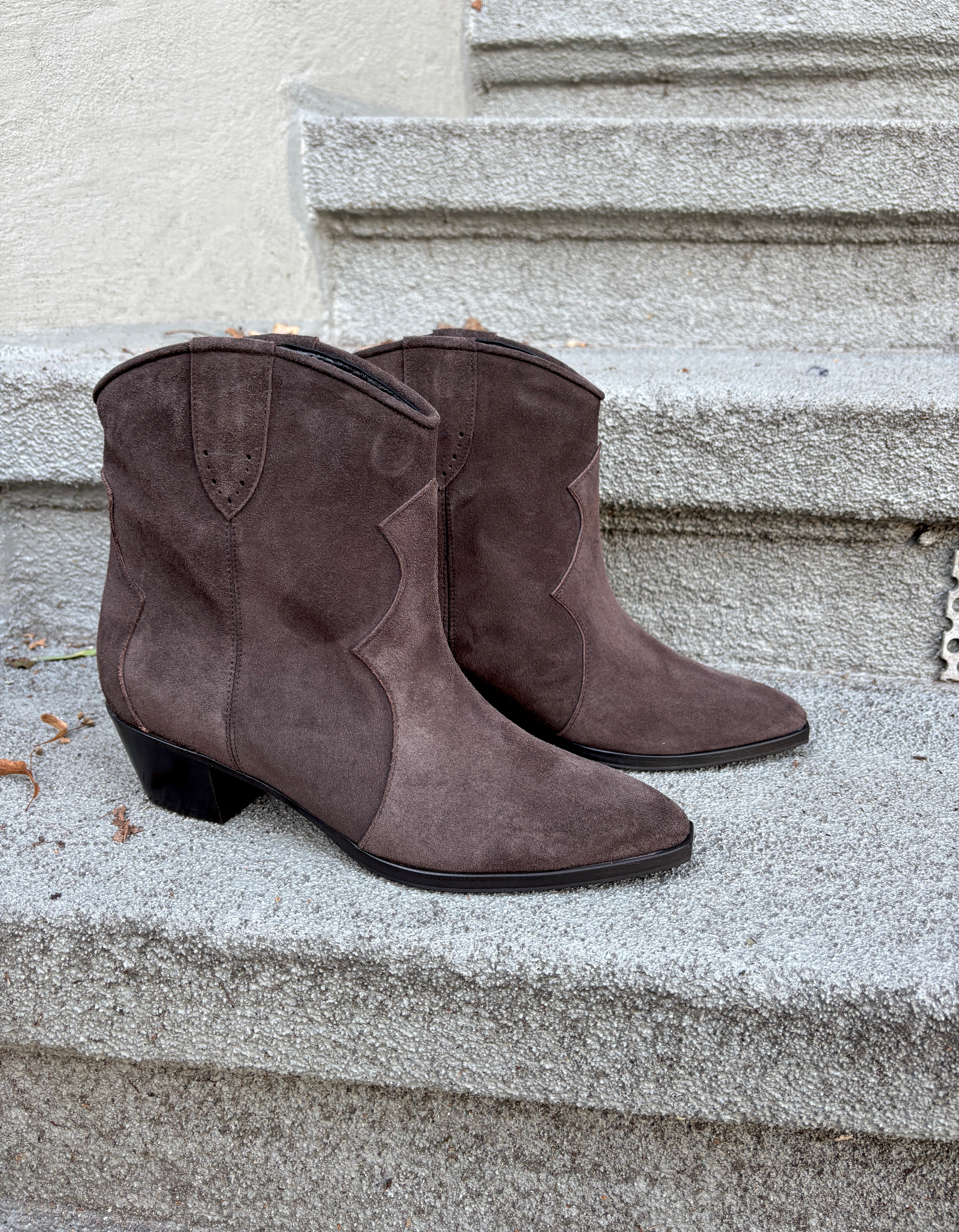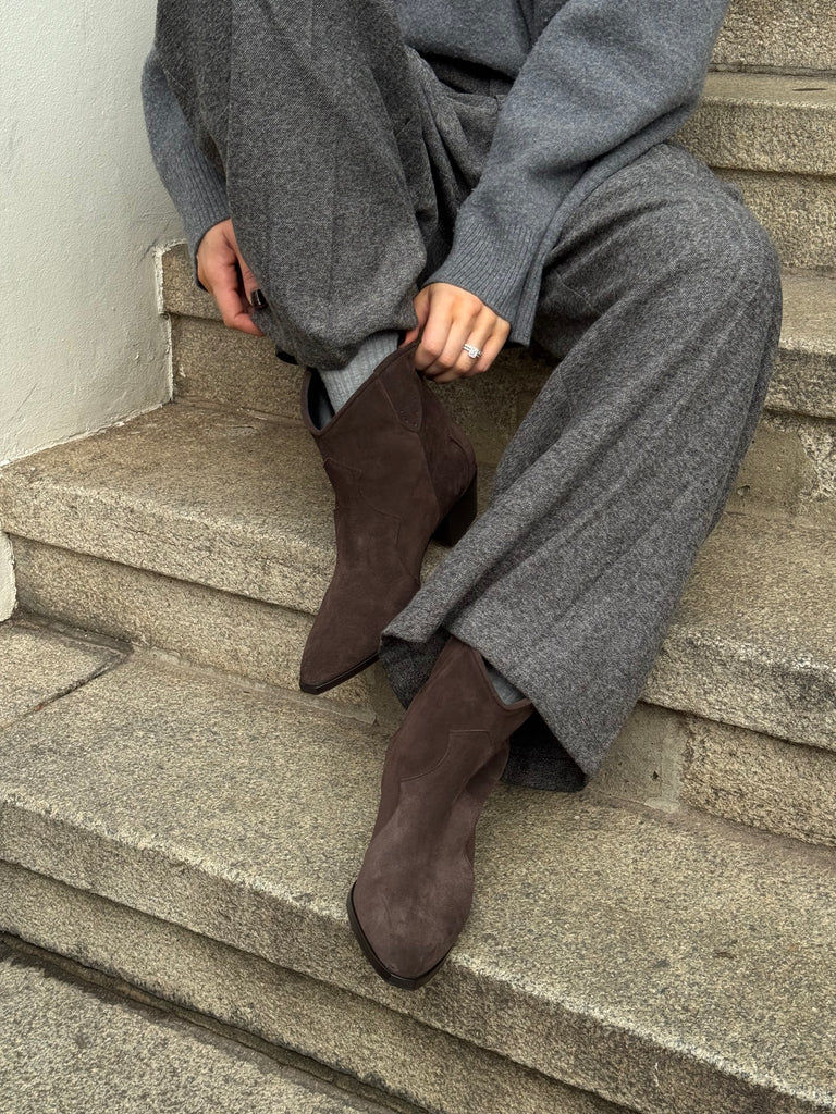 Dieser Ankle Boot im Western-Stil besteht aus dunkelbraunem Veloursleder und verfügt über abgerundete Einsätze am Schaft, bequemer kubanischer Absatz und markante Nahtdetails.