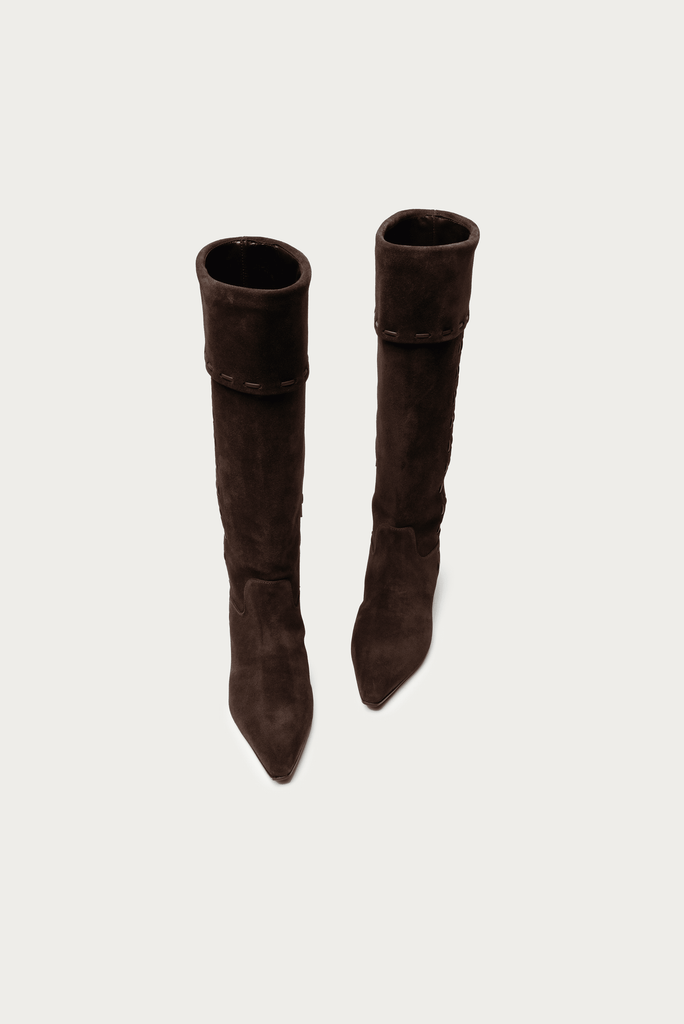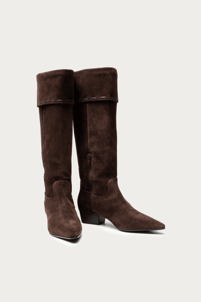 Unsere neuen Stiefel aus Veloursleder wurden in Italien handgefertigt. Das Design mit 4cm hohen Absätzen verfügt über eine spitze Zehenpartie und eine Umschlagklappe mit geflochtenen Lederdetails.
