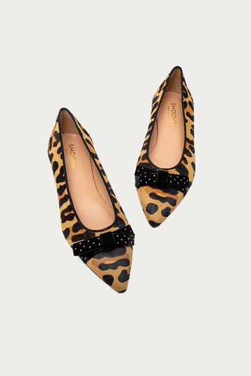 Diese spitzen Ballerinas vereinen cooles Design mit italienischer Handwerkskunst. Durch den Leoprint und einer schwarzen Schleife aus Samt mit kleinen goldenen Nieten Details bekommt der Ballerina einen ganz besonderen Look.