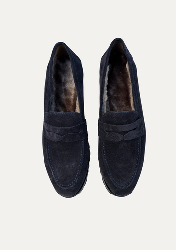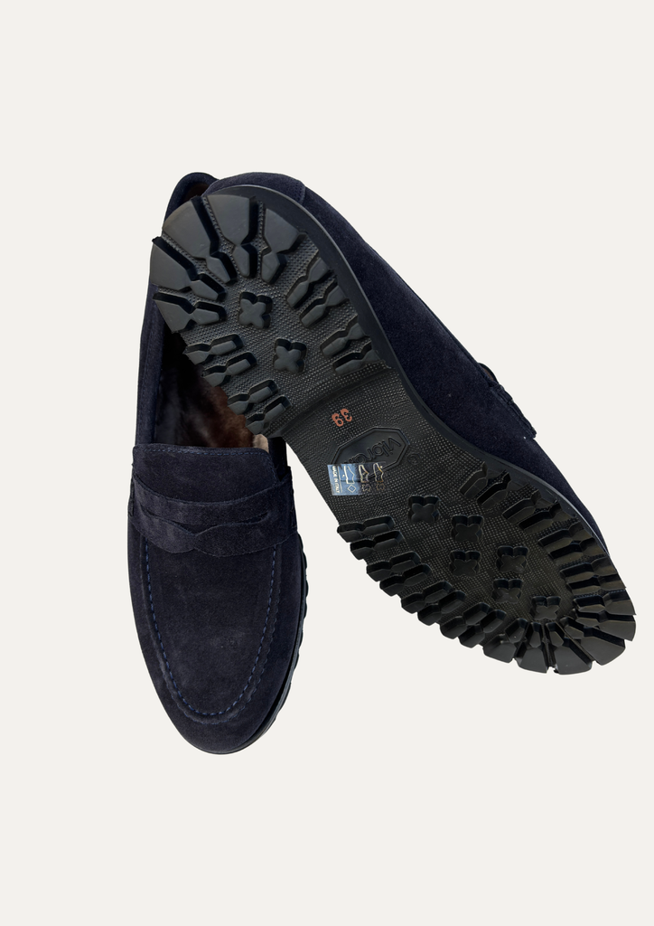 Diese mit Lammfell gefütterten Loafers sind eine zeitlose Option mit einem toughen Twist. Sie sind aus Velour Leder gefertigt und mit Mokassin-Nähten, Penny-Stegen und markanten Laufsohlen ausgestattet.