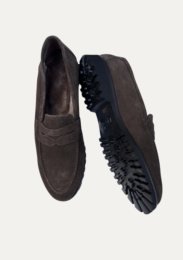 Diese mit Lammfell gefütterten Loafers sind eine zeitlose Option mit einem toughen Twist. Sie sind aus Velour Leder gefertigt und mit Mokassin-Nähten, Penny-Stegen und markanten Laufsohlen ausgestattet.